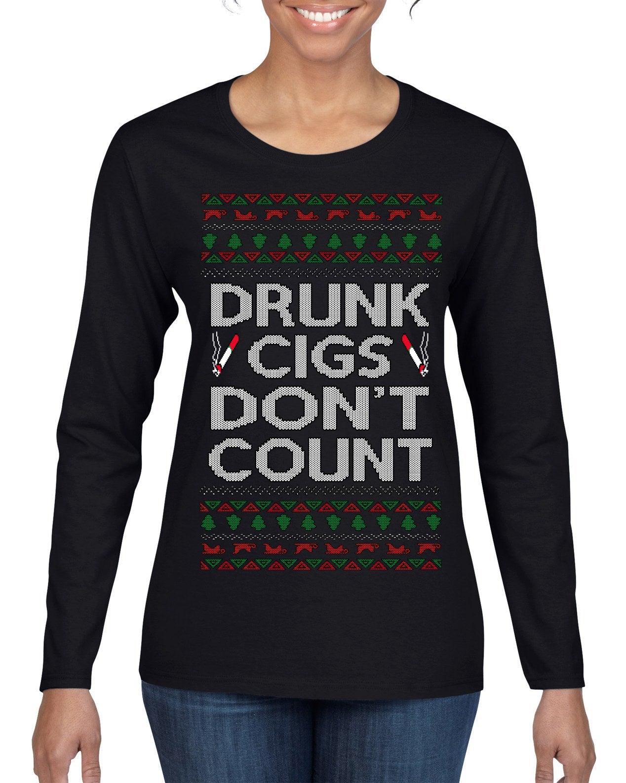 Drunk Cigs Don't Count Funny Cigarette Smoker Cig Ugly Christmas Sweater Womens Graphic Long Sleeve T-Shirt