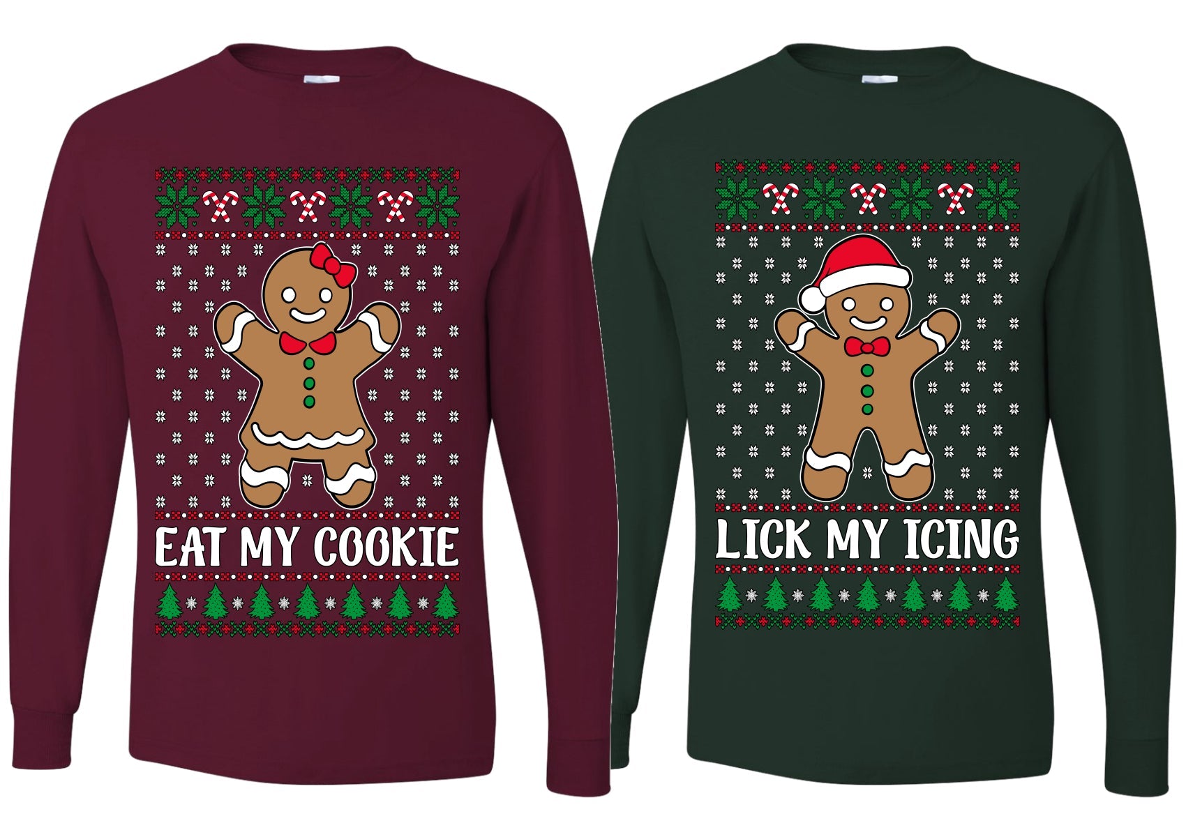 Eat My Cookie Lick My Icing Naughty Gingerbread Ugly Christmas Matching Couples Long Sleeve Shirt