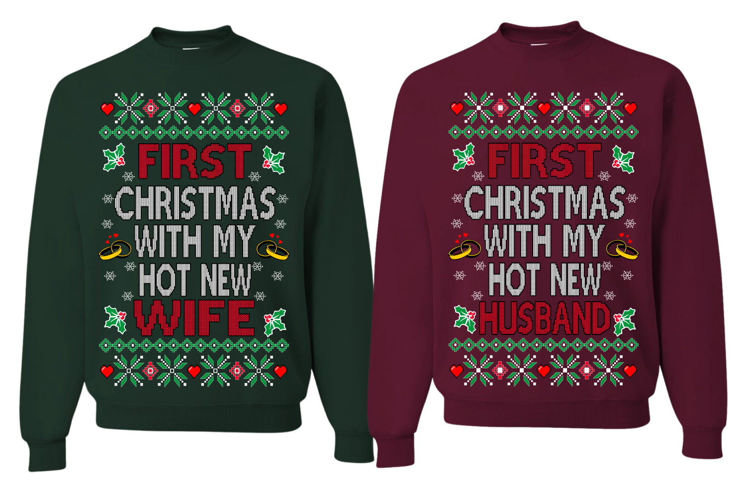 First Christmas With My Hot New Husband, New Wife, Classic Just Married Winter Holiday Newlywed Fiancee Marriage Wedding Girlfriend Boyfriend Gift His and Hers Matching Ugly Christmas Couples Sweater Crewneck Sweatshirt