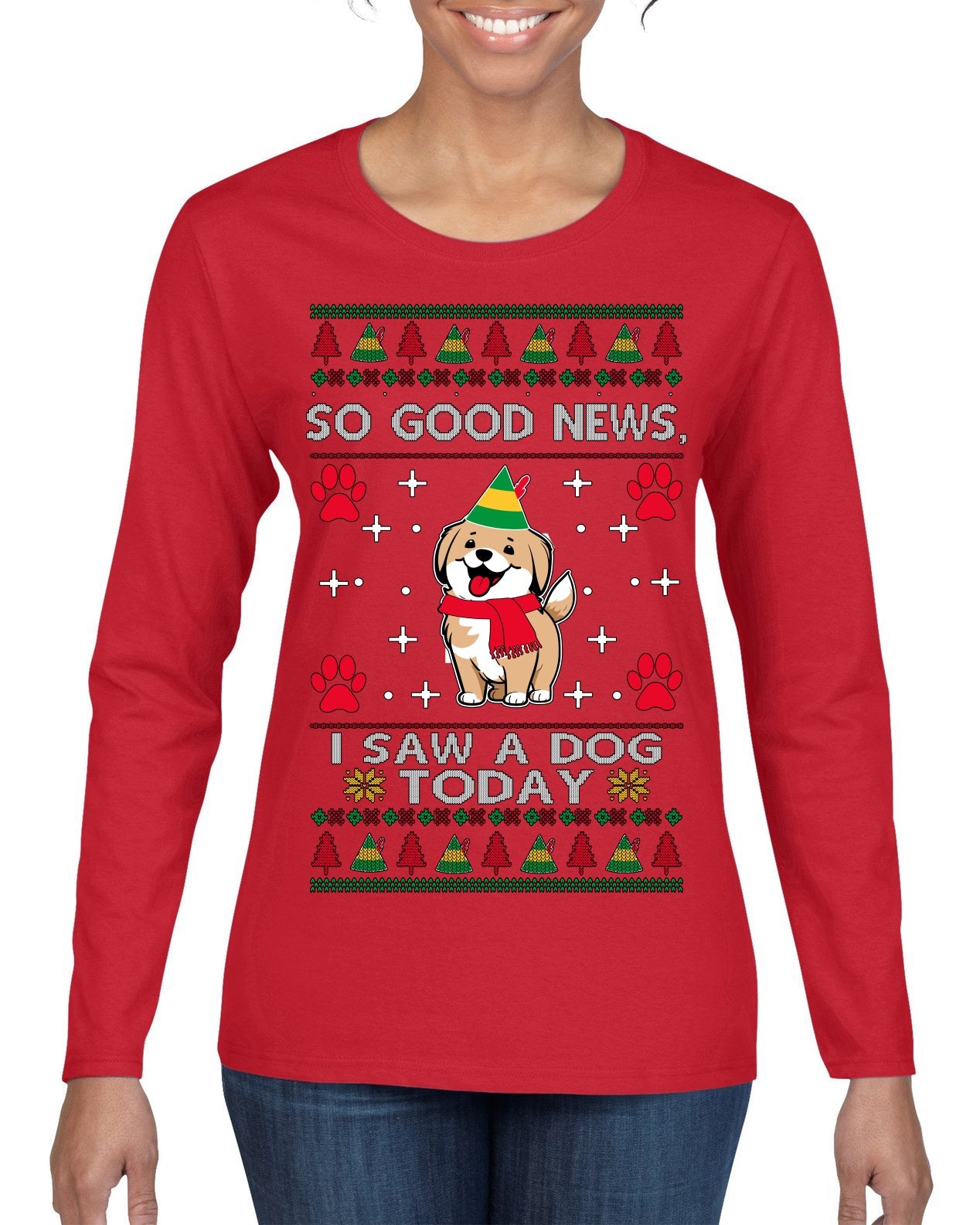Good News I Saw a Dog Today Funny Ugly Christmas Sweater Womens Graphic Long Sleeve T-Shirt