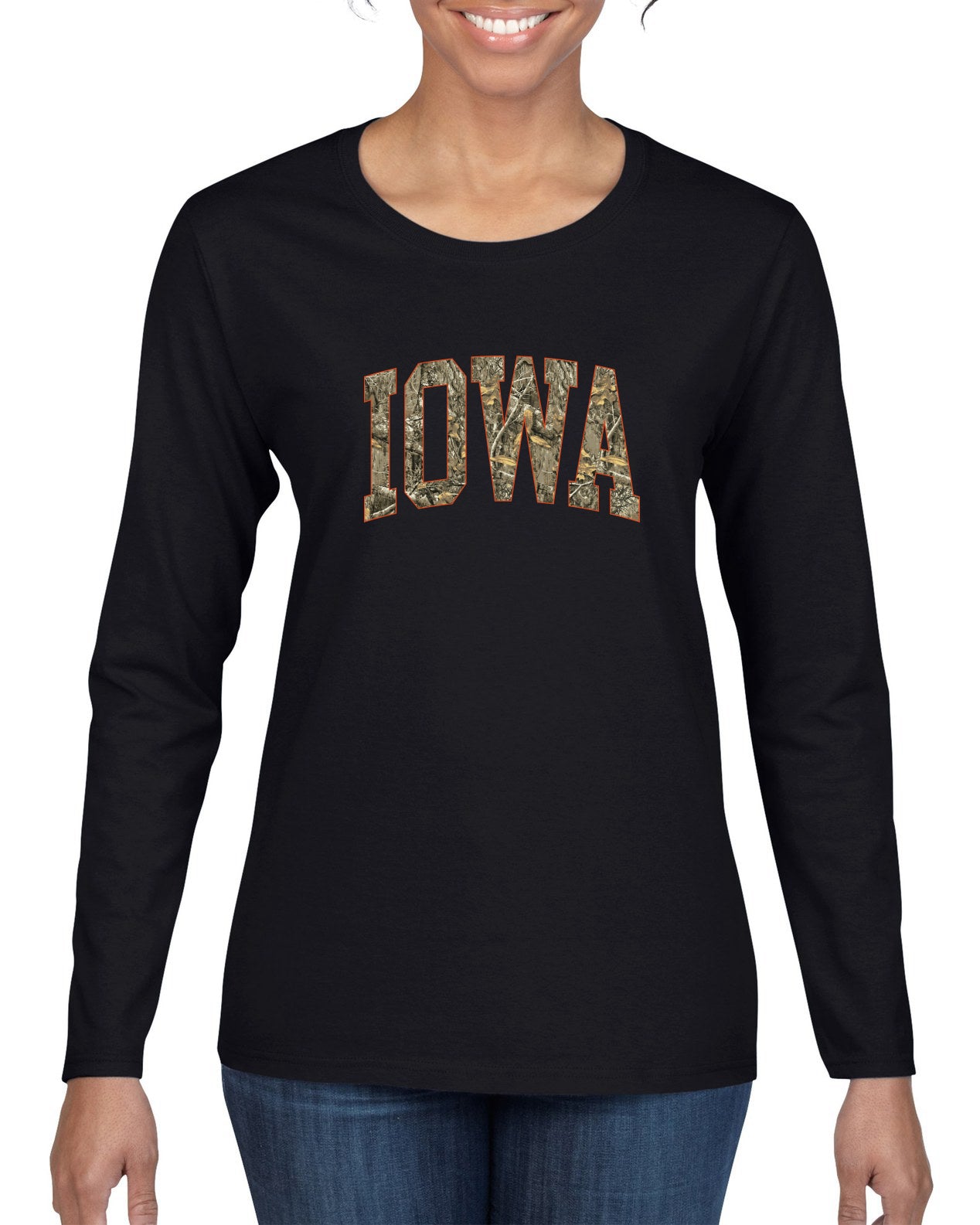 Iowa Camo Fill Orange Outline Sweater, Womens Graphic Long Sleeve T-Shirt