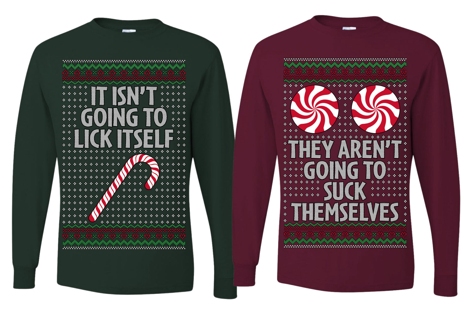 It Isn't Going to Lick Itself Candy Cane They Won't Suck Themselves Funny Couples Shirt Girlfriend Boyfriend Gift His and Hers Matching Ugly Christmas Couple Long Sleeve Shirt