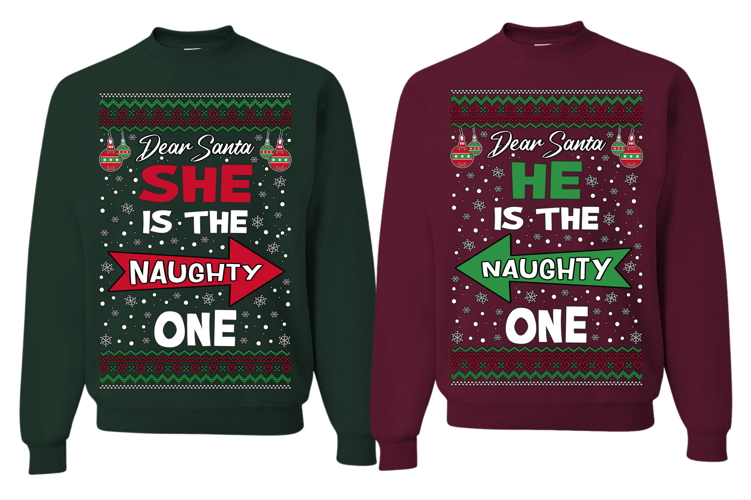 She is Naughty One, He is the Naughty One Funny Couples Sweatshirt Ugly Christmas Matching Couple Sweater Crewneck Sweatshirt