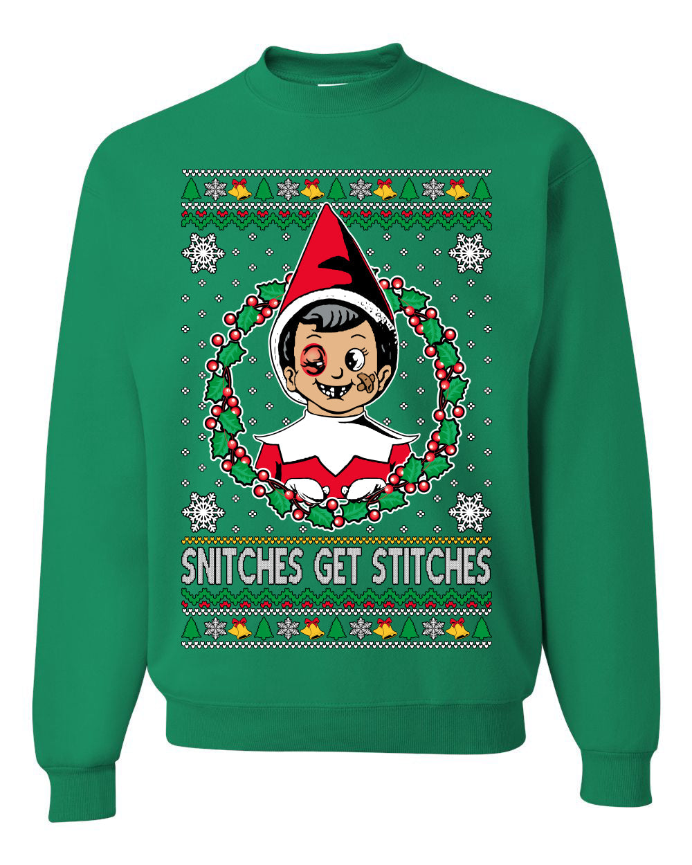 Snitches Get Stitches Meme Elf On A Ugly Christmas Sweater Unisex Crewneck Sweatshirt