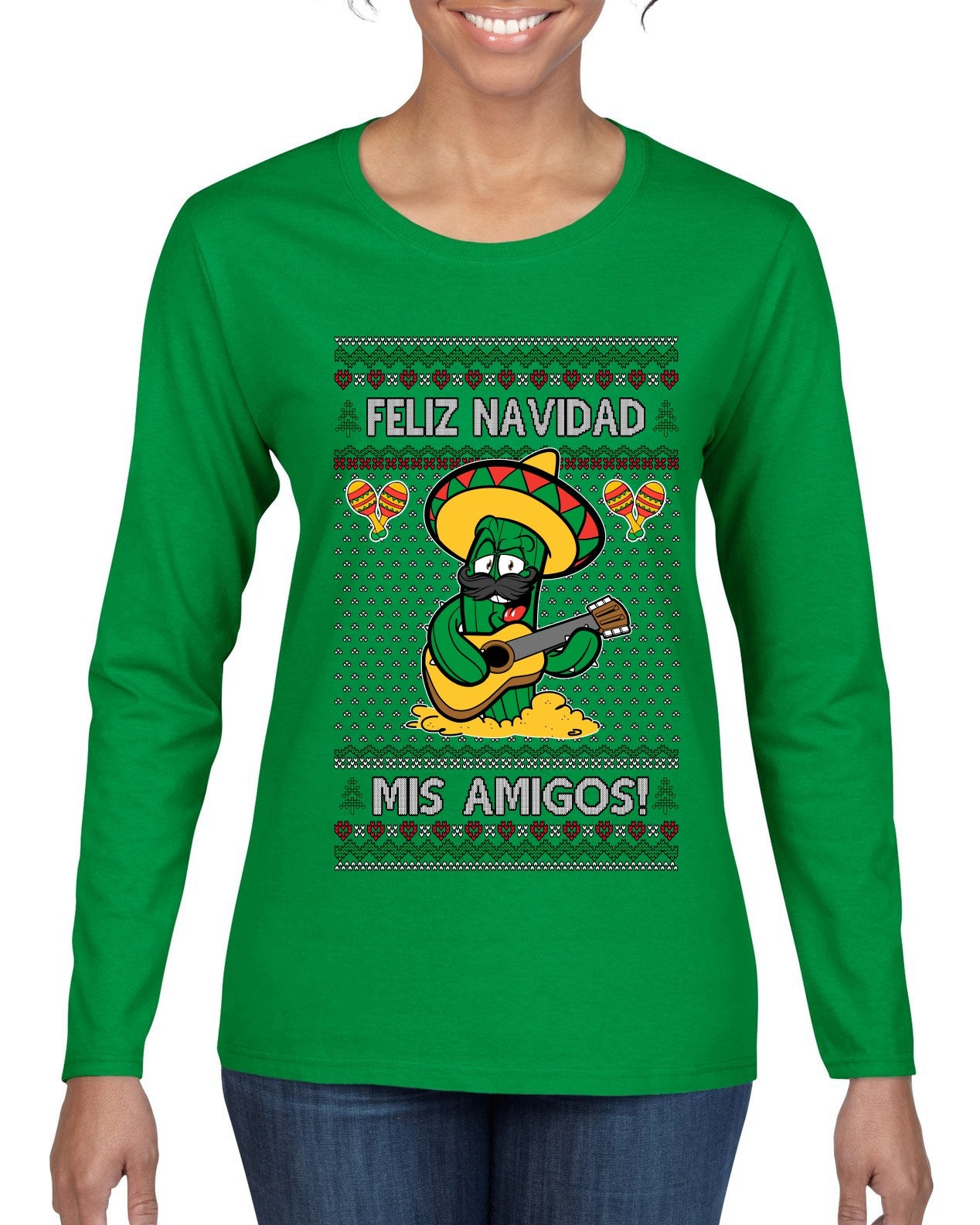 Feliz Navidad Mis Amigos!, Ugly Christmas Sweater Womens Graphic Long Sleeve T-Shirt